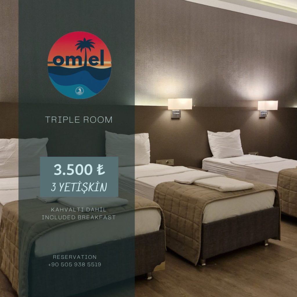 Omtel Otel de 1 adet triple oda (üç tek yataklı) bulunmaktadır. 45 metrekarelik odamızda merkezi ısıtma, klima, akıllı televizyon, minibar buz dolabı, saç kurutma makinesi, balkon ve sınırsız WİFİ mevcuttur. Otelimizde 24 saat sıcak su bulunmaktadır. Odalarımız deniz manzaralıdır.