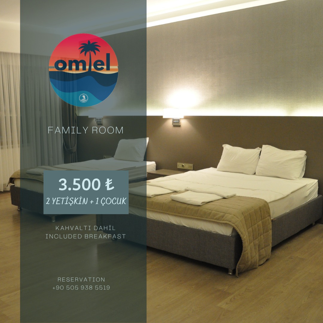 Omtel Otel de 4 adet aile odası bulunmaktadır. 45 metrekarelik odamızda merkezi ısıtma, klima, akıllı televizyon, minibar buz dolabı, saç kurutma makinesi, balkon ve sınırsız WİFİ mevcuttur. Otelimizde 24 saat sıcak su bulunmaktadır. Odalarımız deniz manzaralıdır.