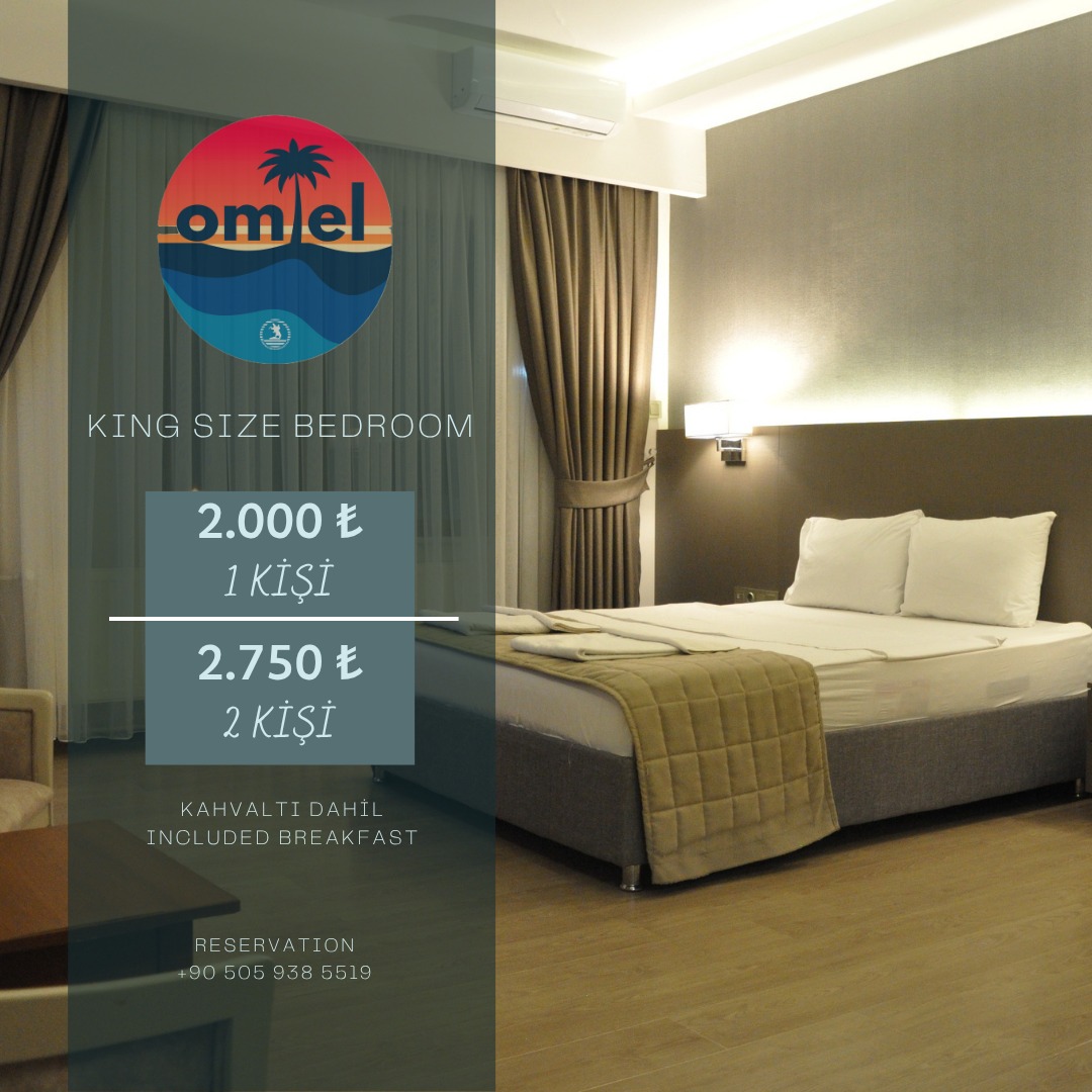 Omtel Otel de 15 adet double odamız bulunmaktadır. 40 metrekarelik odamızda merkezi ısıtma, klima, akıllı televizyon, minibar buz dolabı, saç kurutma makinesi, balkon ve sınırsız WİFİ mevcuttur. Otelimizde 24 saat sıcak su bulunmaktadır. Odalarımız deniz manzaralıdır.