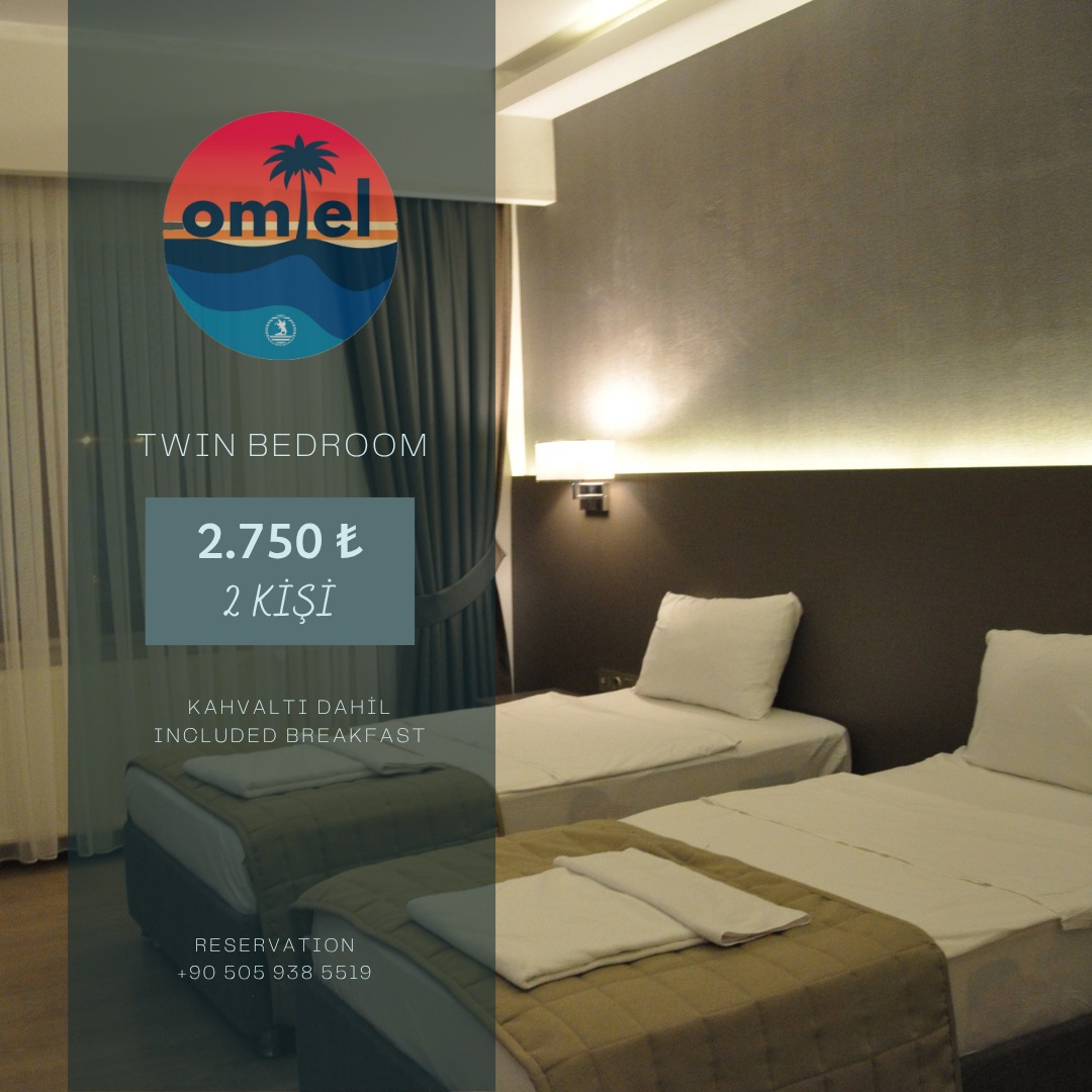 Omtel Otel de 21 adet twin oda (iki tek yataklı) bulunmaktadır. 20 metrekarelik odamızda merkezi ısıtma, klima, akıllı televizyon, minibar buz dolabı, saç kurutma makinesi, balkon ve sınırsız WİFİ mevcuttur. Otelimizde 24 saat sıcak su bulunmaktadır. Odalarımız deniz manzaralıdır.